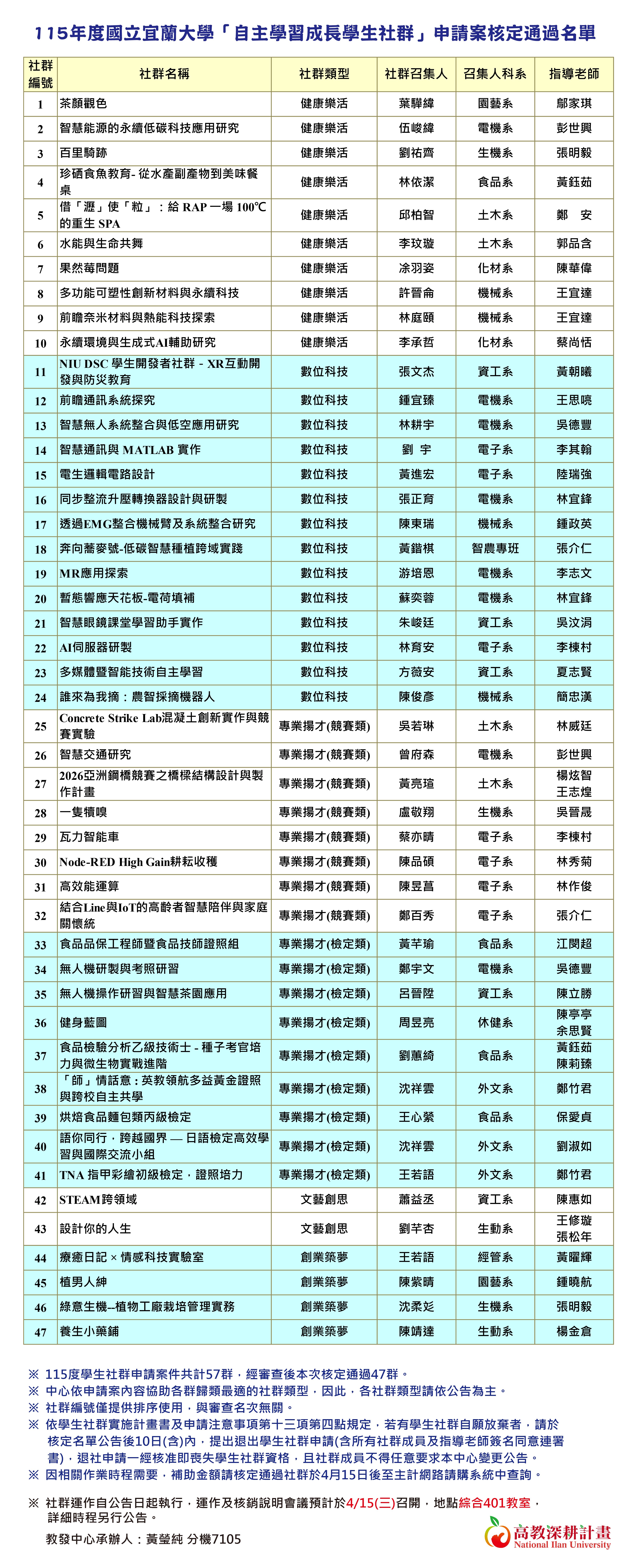 年度國立宜蘭大學「自主學習成長學生社群」申請案核定通過名單