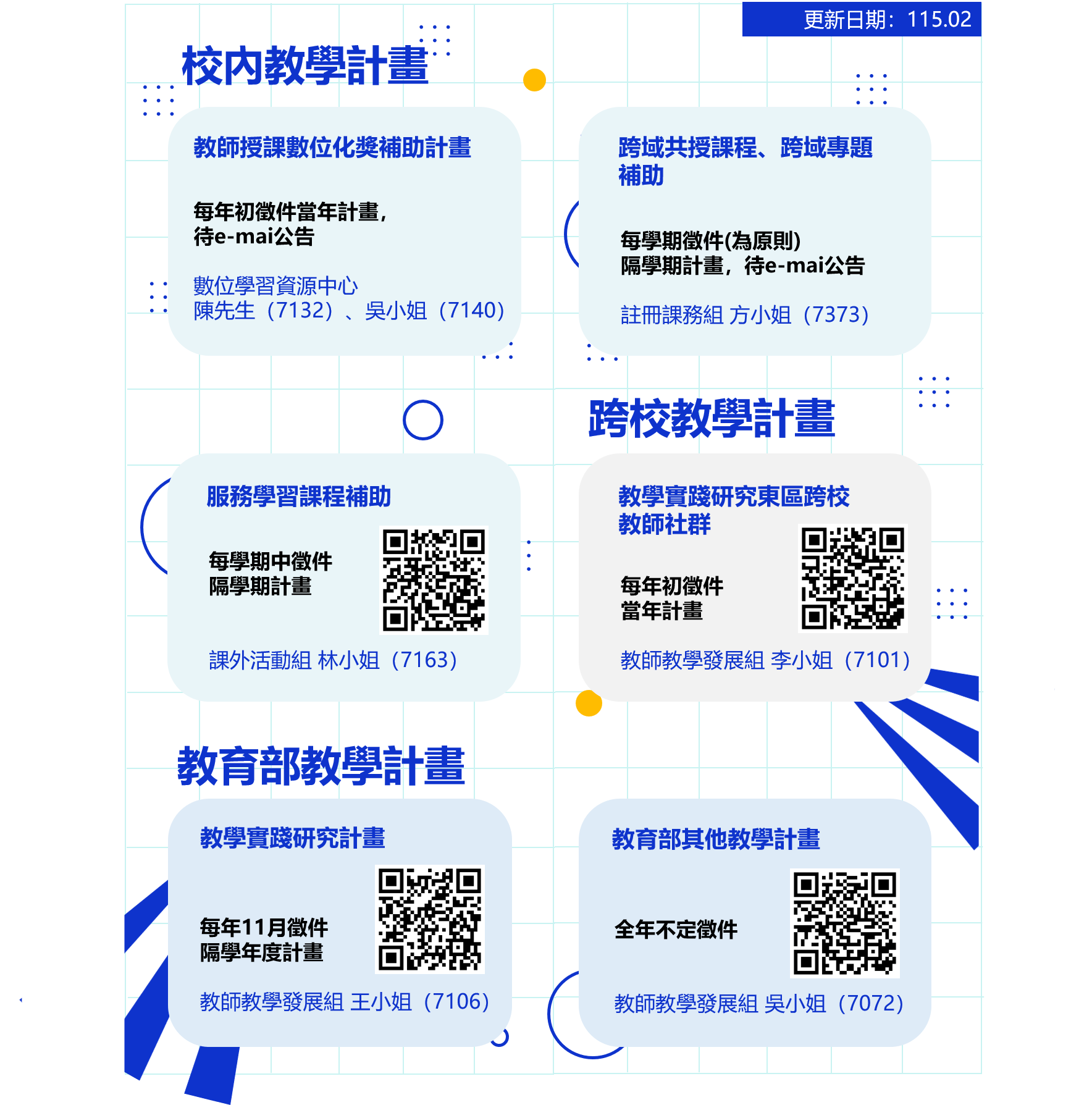 1.「教學品質躍進計畫」-創新教學方案、教師社群優先補助近三年新進教師。計畫每年初徵件當年計畫,連結:https://reurl.cc/xNqpgZ